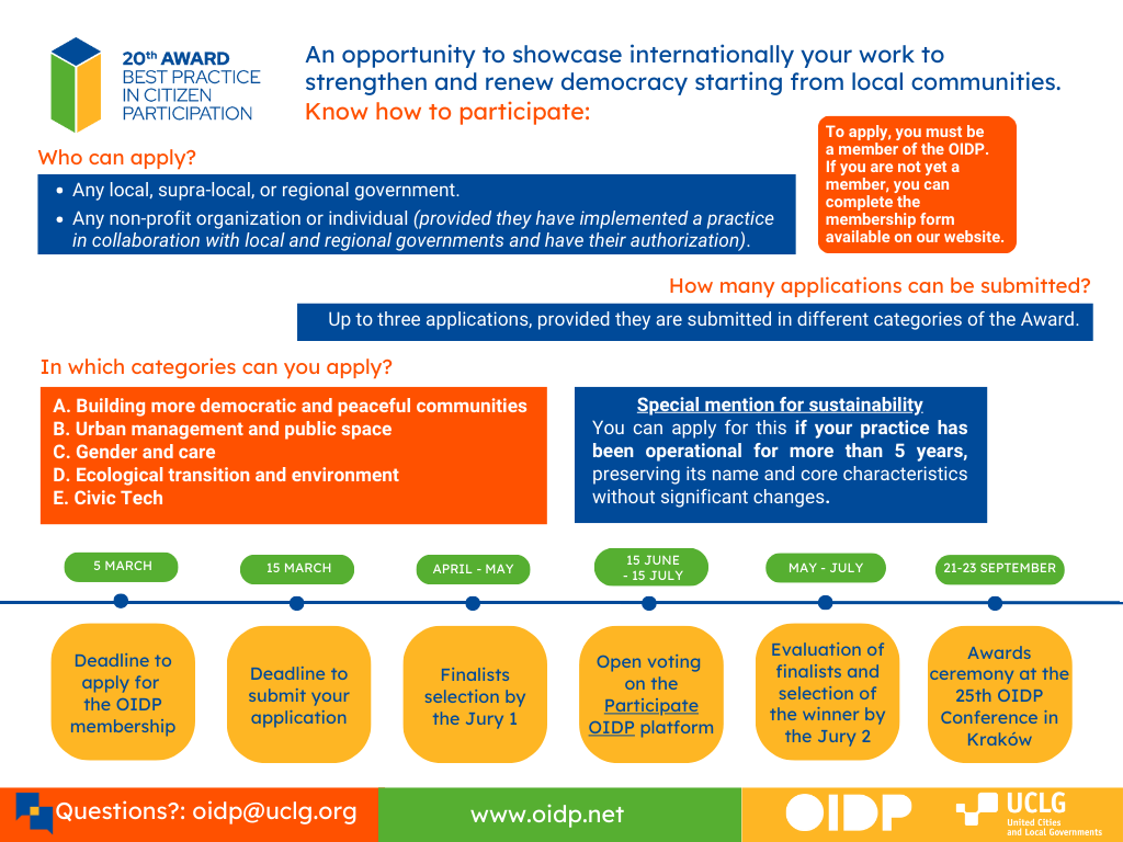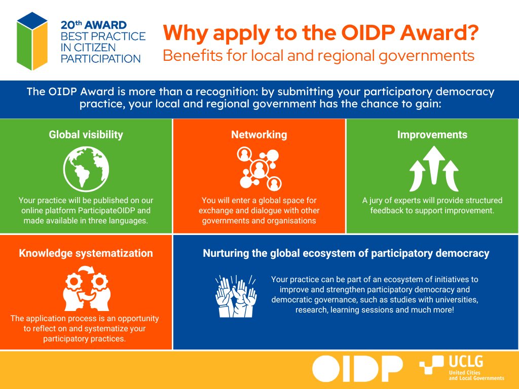 The International Observatory of Participatory Democracy (OIDP) and United Cities and Local Governments (UCLG) invite local and regional governments worldwide to participate in the call for the 20th edition of the OIDP Award “ Best Practice in Citizen Participation,” an international recognition that rewards innovative and transformative projects to enhance participation in local democracy.