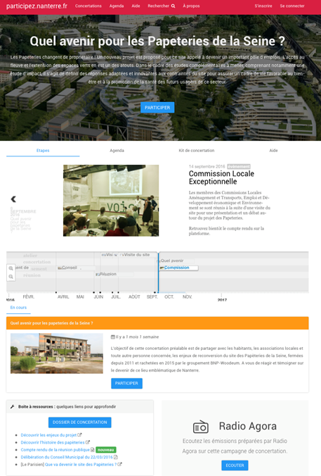 Le dispositif " agora permanente " permet de lancer des campagnes ponctuelles de concertation en s'appuyant sur une plateforme de concertation http://participez.nanterre.fr hybridée avec les outils de concertation en présentiel.